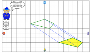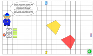 Età. 8 – 10 anni Descrizione. Le tre app propongono di spostare un quadrilatero su una griglia utilizzando i pulsanti “Nord”, “Sud”, “Est”, “Ovest”. Ad ogni clic direzionale corrisponde lo spostamento di un trattino della griglia. Sulla griglia sono indicate attraverso una lettera (N, S, E, O) le quattro posizioni in modo da facilitarne la memorizzazione. Sono sempre visibili la posizione iniziale del poligono e quella finale, in modo da visualizzare lo spostamento. Se le indicazioni sono corrette appaiono 4 segmenti che collegano i vertici del quadrilatero iniziale a quelli del quadrilatero trasformato. Con gli allievi è bene specificare che si tratta di una precisa trasformazione geometrica: la traslazione. Questa trasformazione risulta molto intuitiva anche per i bambini più piccoli, che ne potrebbero fare esperienza concreta anche attraverso lo spostamento del proprio corpo su una griglia reale costruita sul pavimento. Attraverso questa app si pone inoltre l’attenzione su come lo spostamento finale sia ottenuto dalla combinazione di due spostamenti intermedi, uno in direzione Nord o Sud e uno in direzione Ovest o Est. È opportuno stimolare l’osservazione degli allievi su quali sono gli elementi che cambiano o non cambiano del quadrilatero dopo la trasformazione: ad esempio la forma è diversa? La distanza di ciascun nuovo vertice da quelli originali è la stessa? |