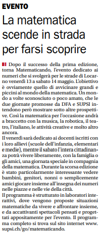 Leggi l’articolo “La matematica scende in strada per farsi scoprire” pubblicato sul Corriere del Ticino il 7 maggio 2016.