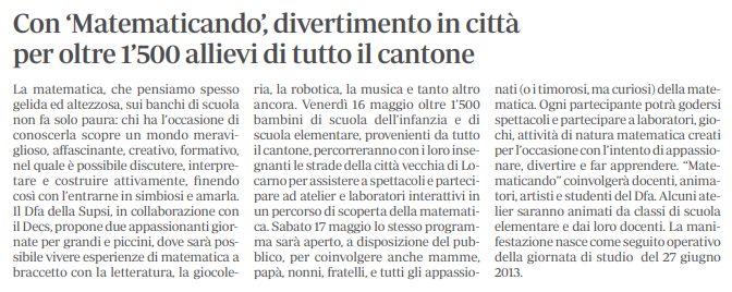 Leggi l’articolo “Con ‘Matematicando’, divertimento in città” pubblicato su la Regione il 10 maggio 2014.