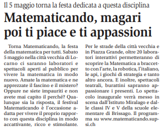 Leggi l’articolo “Matematicando, magari poi ti piace e ti appassioni” pubblicato sul Giornale del Popolo il 27 aprile 2018.